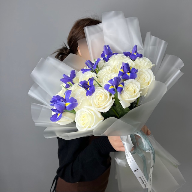 Состав: белые розы -15, ирис -10, стильно оформлено в пленке