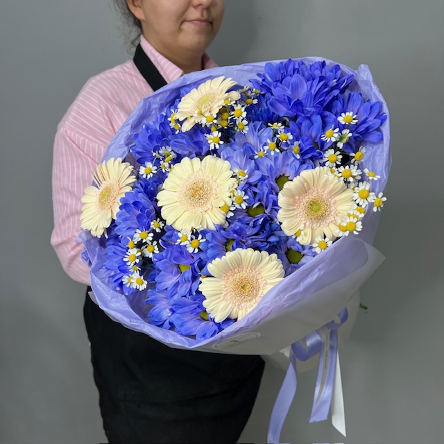 Состав: Хризантема ромашка сиренев -5, гербера мини кремов-5, танацетум -5, тишью-3, пленка -2, лента-2. стильно оформлено